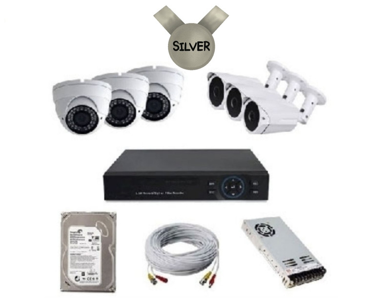 پکیج دوربین مداربسته 6 عددی نوع نقره ای دارای تمامی تجهیزات مورد نیاز برای نصب دوربین مدار بسته میباشد.